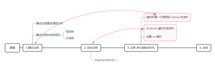 静态注册是在首次调用 Java native 方法时搜索对应的 JNI 函数,而动态注册则是提前手动建立映射关系,并且不需要遵守静态注册的 JNI 函数命名规则。