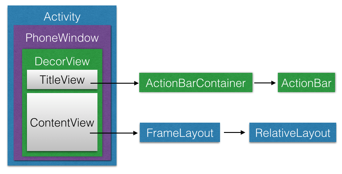 我们来对上图做出简单解释:DecorView是一个应用窗口的根容器,它本质上是一个FrameLayout。DecorView有唯一一个子View,它是一个垂直LinearLayout,包含两个子元素,一个是TitleView(ActionBar的容器),另一个是ContentView(窗口内容的容器)。关于ContentView,它是一个FrameLayout(android.R.id.content),我们平常用的setContentView就是设置它的子View。上图还表达了每个Activity都与一个Window(具体来说是PhoneWindow)相关联,用户界面则由Window所承载。