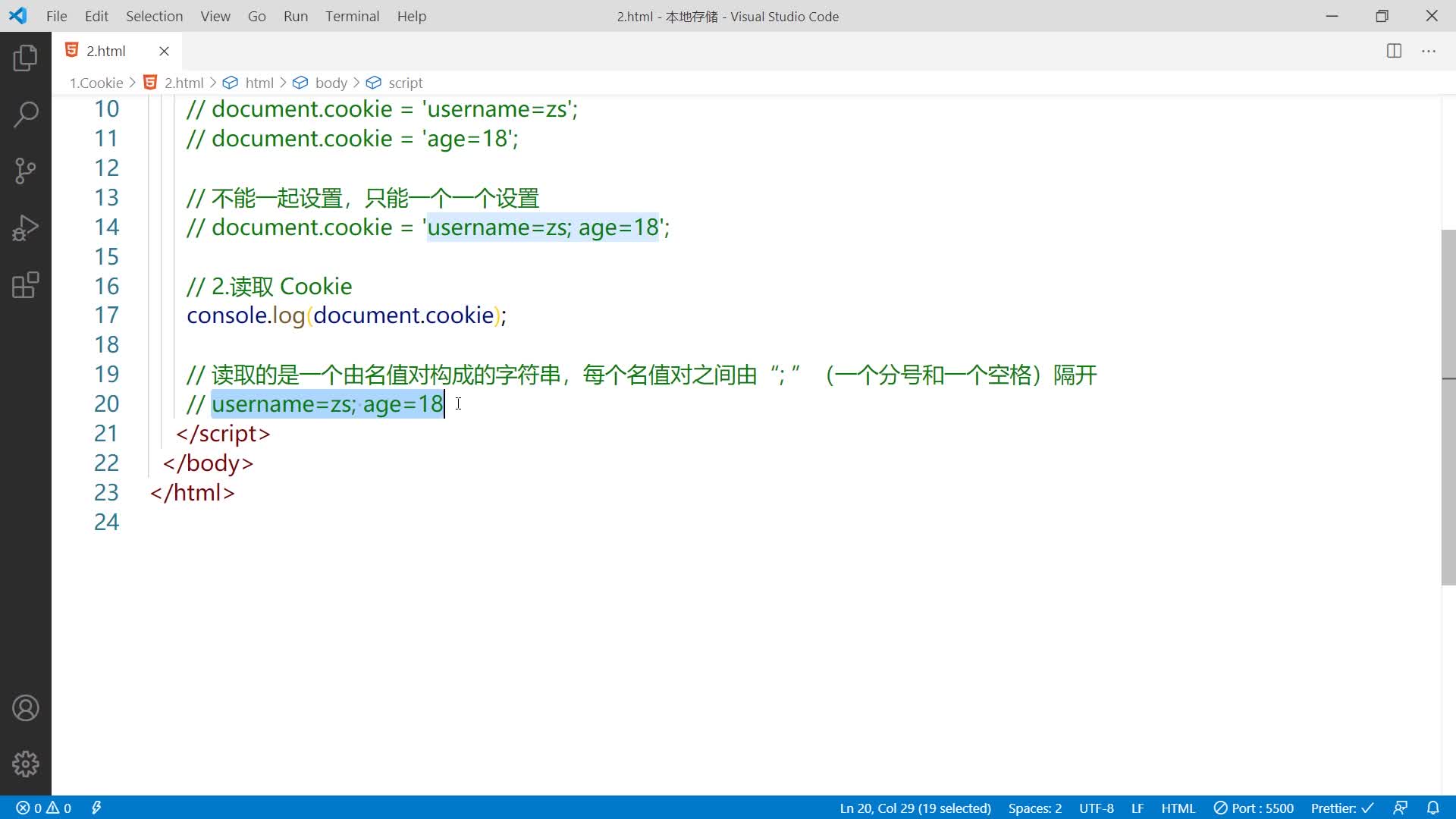 如document.cookie=‘username=zs,age=18’这样的写法是错误的,这样写只会得到第一个cookie