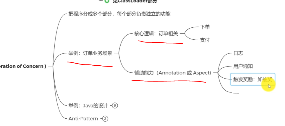 AOP的目的就是关注点分离**,关注点分离,就是业务代码中不包含其他业务的代码,例如:订单代码,不应该把日志的代码放到业务代码中。掺杂其他功能的代码。**