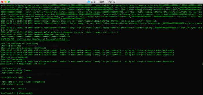 ./sbin/stop-all.sh ./bin/hdfs namenode -format ./sbin/start-dfs.sh ./bin/hdfs dfs -mkdir /user ./bin/hdfs dfs -mkdir /user/zhangzhaobo ./sbin/start-yarn.sh hdfs dfs -put Know.py