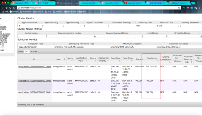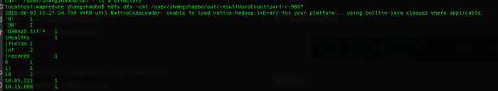 2018-06-03 15:25:38,662 WARN util.NativeCodeLoader: Unable to load native-hadoop library for your platform... using builtin-java classes where applicable2018-06-03 15:25:39,697 INFO client.RMProxy: Connecting to ResourceManager at /0.0.0.0:80322018-06-03 15:25:40,514 INFO mapreduce.JobResourceUploader: Disabling Erasure Coding for path: /tmp/hadoop-yarn/staging/zhangzhaobo/.staging/job_1528008869850_00032018-06-03 15:25:40,819 INFO input.FileInputFormat: Total input files to process : 12018-06-03 15:25:40,910 INFO mapreduce.JobSubmitter: number of splits:12018-06-03 15:25:40,960 INFO Configuration.deprecation: yarn.resourcemanager.system-metrics-publisher.enabled is deprecated. Instead, use yarn.system-metrics-publisher.enabled2018-06-03 15:25:41,104 INFO mapreduce.JobSubmitter: Submitting tokens for job: job_1528008869850_00032018-06-03 15:25:41,106 INFO mapreduce.JobSubmitter: Executing with tokens: []2018-06-03 15:25:41,372 INFO conf.Configuration: resource-types.xml not found2018-06-03 15:25:41,373 INFO resource.ResourceUtils: Unable to find 'resource-types.xml'.2018-06-03 15:25:41,463 INFO impl.YarnClientImpl: Submitted application application_1528008869850_00032018-06-03 15:25:41,513 INFO mapreduce.Job: The url to track the job: http://localhost:8088/proxy/application_1528008869850_0003/2018-06-03 15:25:41,514 INFO mapreduce.Job: Running job: job_1528008869850_00032018-06-03 15:25:50,700 INFO mapreduce.Job: Job job_1528008869850_0003 running in uber mode : false2018-06-03 15:25:50,702 INFO mapreduce.Job: map 0% reduce 0%2018-06-03 15:25:57,808 INFO mapreduce.Job: map 100% reduce 0%2018-06-03 15:26:04,871 INFO mapreduce.Job: map 100% reduce 100%2018-06-03 15:26:04,887 INFO mapreduce.Job: Job job_1528008869850_0003 completed successfully2018-06-03 15:26:05,005 INFO mapreduce.Job: Counters: 49 File System Counters FILE: Number of bytes read=2684 FILE: Number of bytes written=431255 FILE: Number of read operations=0 FILE: Number of large read operations=0 FILE: Number of write operations=0 HDFS: Number of bytes read=2281 HDFS: Number of bytes written=2126 HDFS: Number of read operations=8 HDFS: Number of large read operations=0 HDFS: Number of write operations=2 Job Counters Launched map tasks=1 Launched reduce tasks=1 Data-local map tasks=1 Total time spent by all maps in occupied slots (ms)=4094 Total time spent by all reduces in occupied slots (ms)=4530 Total time spent by all map tasks (ms)=4094 Total time spent by all reduce tasks (ms)=4530 Total vcore-milliseconds taken by all map tasks=4094 Total vcore-milliseconds taken by all reduce tasks=4530 Total megabyte-milliseconds taken by all map tasks=4192256 Total megabyte-milliseconds taken by all reduce tasks=4638720 Map-Reduce Framework Map input records=36 Map output records=191 Map output bytes=2902 Map output materialized bytes=2684 Input split bytes=126 Combine input records=191 Combine output records=138 Reduce input groups=138 Reduce shuffle bytes=2684 Reduce input records=138 Reduce output records=138 Spilled Records=276 Shuffled Maps =1 Failed Shuffles=0 Merged Map outputs=1 GC time elapsed (ms)=154 CPU time spent (ms)=0 Physical memory (bytes) snapshot=0 Virtual memory (bytes) snapshot=0 Total committed heap usage (bytes)=407896064 Shuffle Errors BAD_ID=0 CONNECTION=0 IO_ERROR=0 WRONG_LENGTH=0 WRONG_MAP=0 WRONG_REDUCE=0 File Input Format Counters Bytes Read=2155 File Output Format Counters Bytes Written=2126