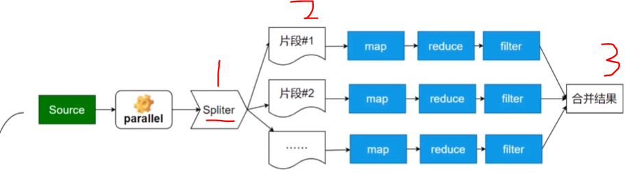1, 拆分是通过spliter,每份的大小,默认每份1024,如果拆了100份,线程池是5个线程,轮流去执行每份数据,最后做合并结果