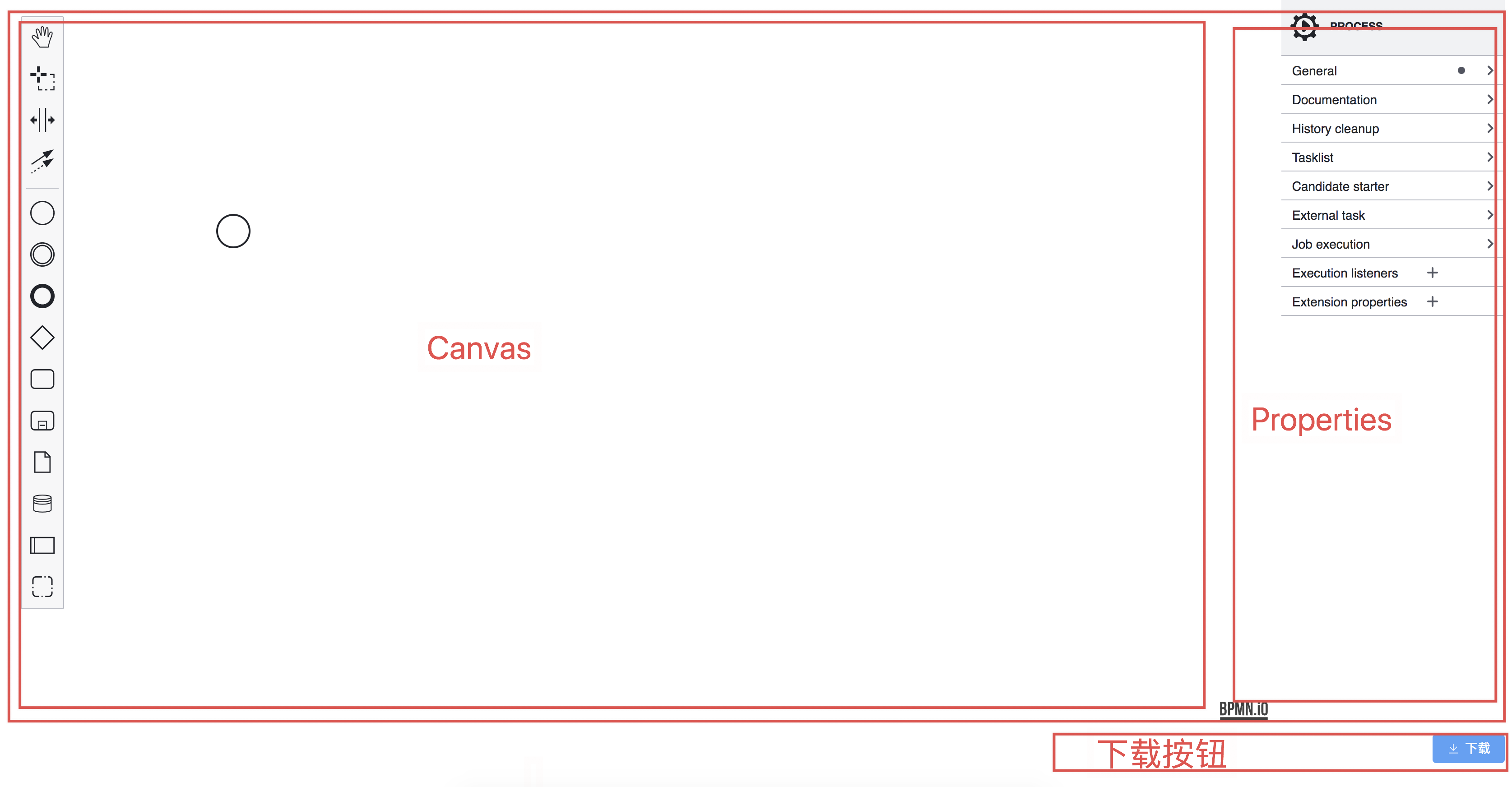 在上面的主绘制区,我们放了两个东西,一个是画布 canvas,另一个是属性 properties,canvas 就是流程图绘制时候的核心区域,properties 则是流程中的每一个节点的属性配置。