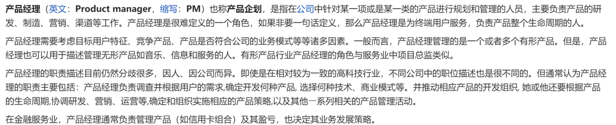 产品经理,突出的是Manager ,产品的管理者,产品的第一负责人,这个产品的开发运营,全生命周期的管控,都由这个Manager负责。代表(腾讯系,百度系)