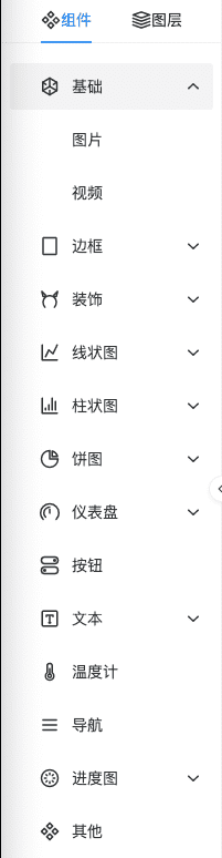 这里要说明的点:componentName是组件在项目中的注册名称,因此必须保证唯一,group是给组件分组,这里的分组主要是展示在组件拖拽页面,其类型的ComponentGroup是固定好的,可以自己增加,展示位置如下: