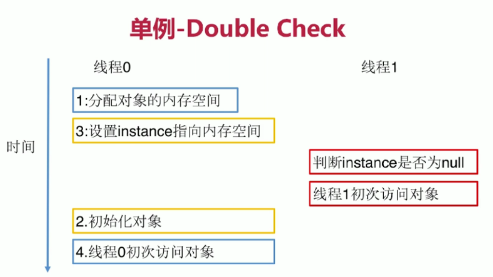 重排序在多线程中存在的问题。线程1要比线程0先访问对象,但是对象还没有初始化,会出现问题。