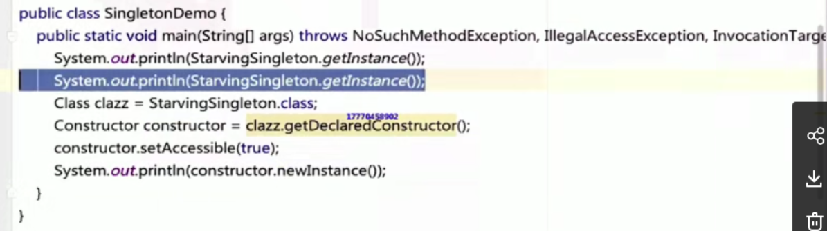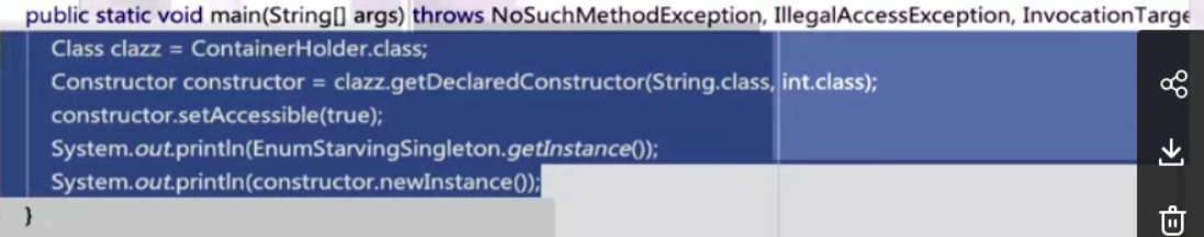 **EnumStarvingSingleton enumStarvingSingleton = (EnumStarvingSingleton)constructor.newInstance()****;**