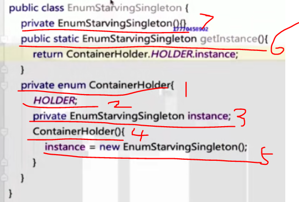 6是通过一个方法返回实例,7是该类的私有构造函数,防止外部创建该类的实例。