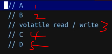 在cpu中的指令:A,B不能重排序,C,D之间也不可以重排序,也就是在当前volatile的作用域内,所有的指令是不允许做重排序。