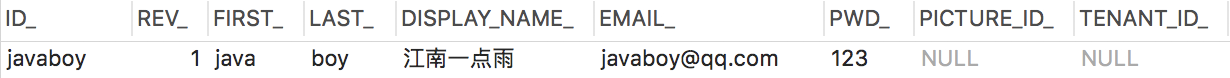 添加之后,我们在数据库的 ACT_ID_USER 表中,就可以看到刚刚加入的数据了: