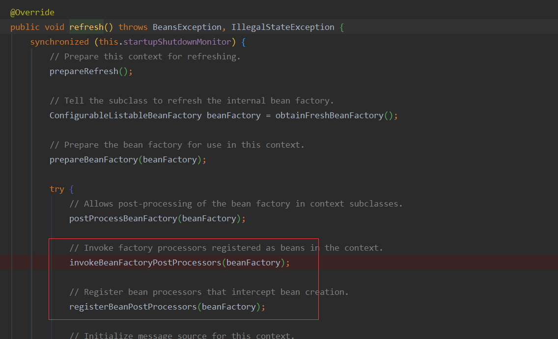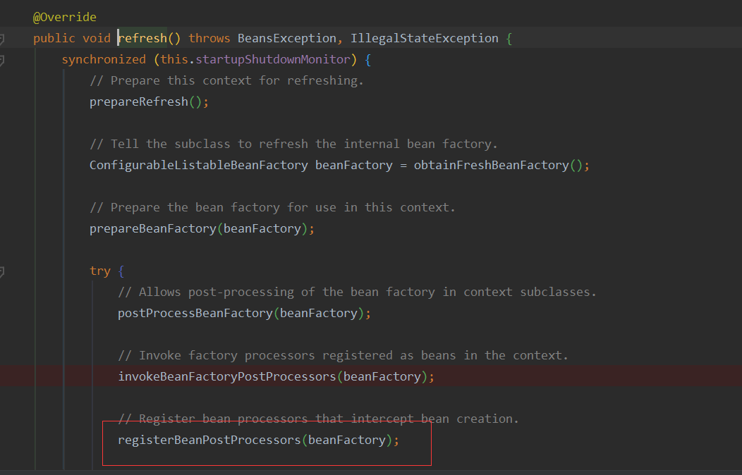 registerBeanPostProcessors还没执行到,意味着各种spring的bean后置处理器还没准备好。比如解析@Autowired注解的AutowiredAnnotationBeanPostProcessor以及解析@PostConstruct注解的CommonAnnotationBeanPostProcessor都还没准备好。因此@Autowired和@PostConstruct自然就不会生效