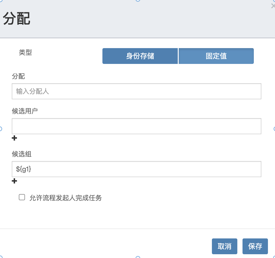 这样,最终生成的 XML 文件则类似这样: flowable:candidateGroups="${g1}"。