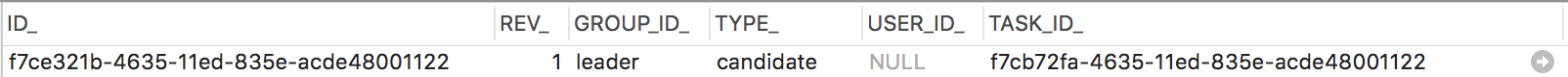 启动成功之后,我们可以在 ACT_RU_IDENTITYLINK 表中查看到用户组和 UserTask 之间的关系: