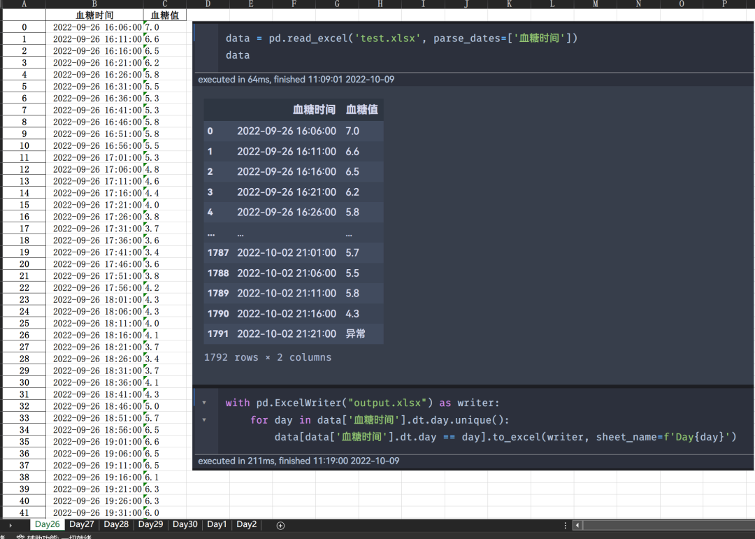 他的原始数据中,7天文件在一个sheet里。记得之前也有写过类似的文章,但是要自己照猫画虎还是有点难度的。
