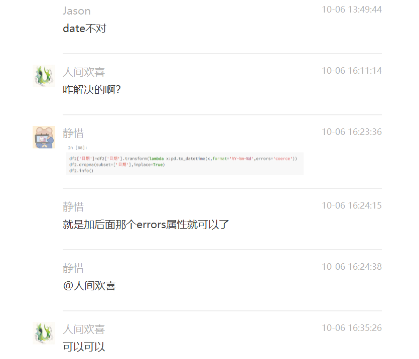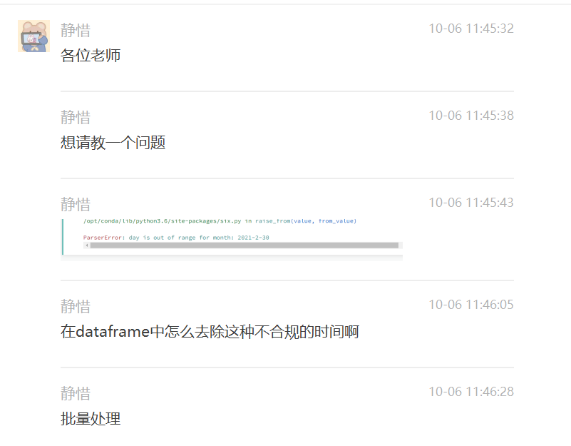 国庆期间在Python钻石交流群【静惜】问了一个Pandas处理的问题,提问截图如下: