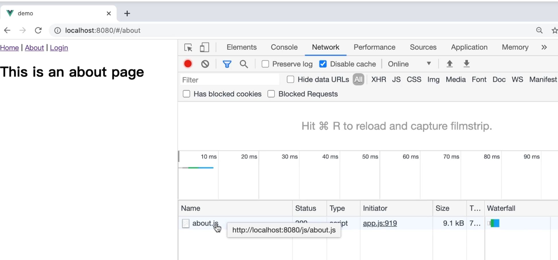 那么这个时候我们就可以用异步的这种import的写法去加载 About组件的代码,它可以做到什么呢?