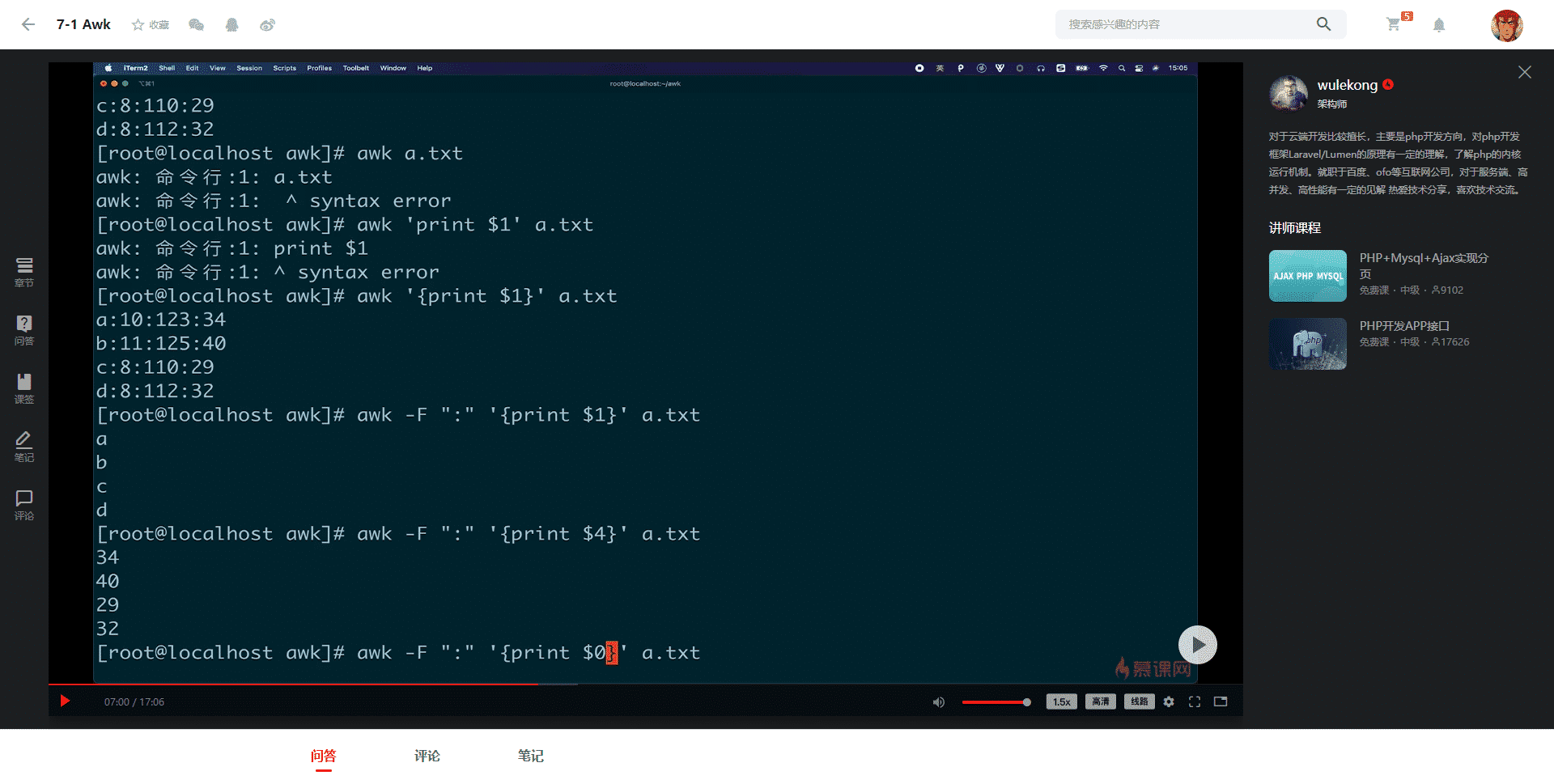 awk.sh 脚本文件会使用 print 命令打印 /etc/passwd 文件的主目录数据字段(字段变量 $6),以及 userid 数据字段(字段变量 $1)。注意,在程序文件中,也可以指定多条命令,只要一条命令放一行即可,之间不需要用分号。