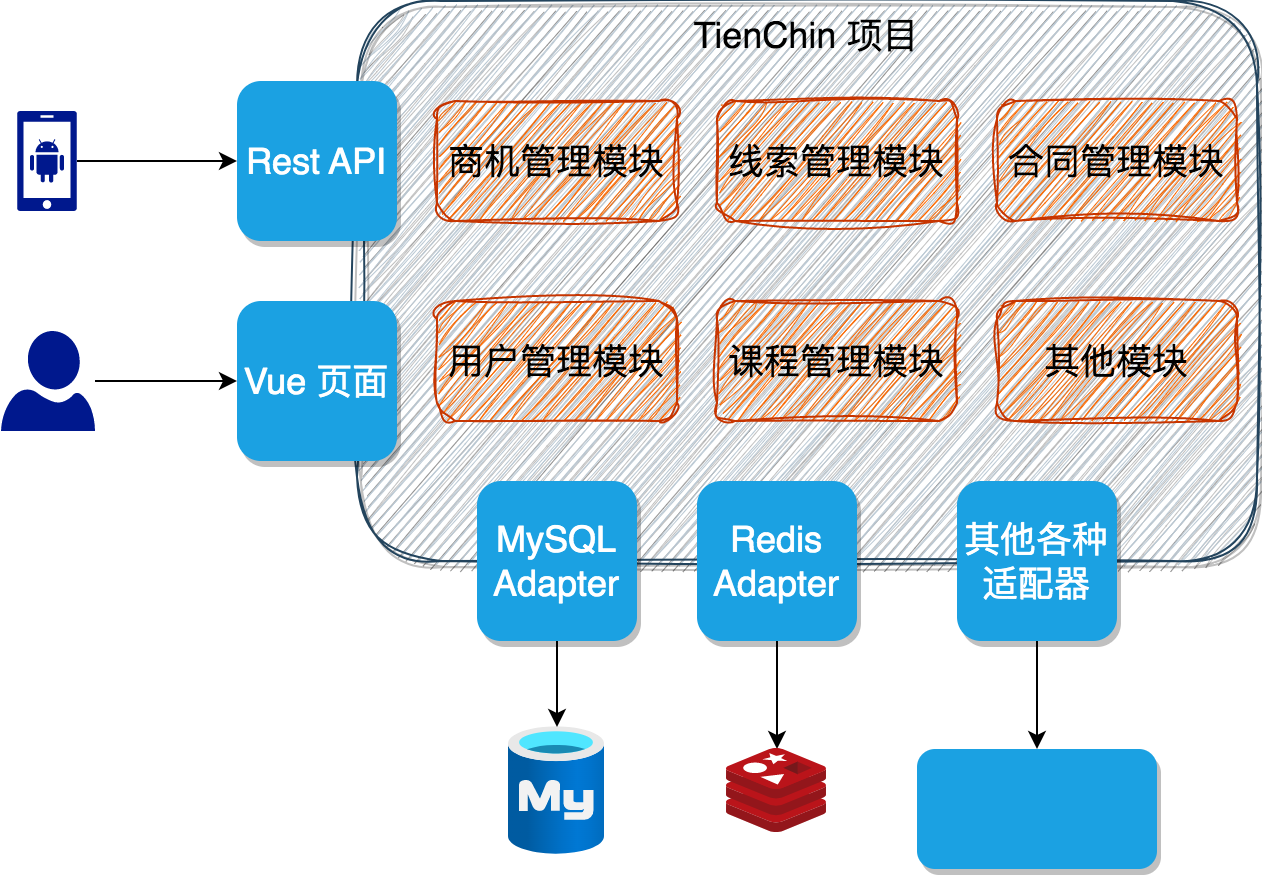 - 入站适配器:就是外部系统来调用我们的系统,REST API 和 Vue 网页都算是入站适配器,外部系统通过这两个接口来调用我们的系统。