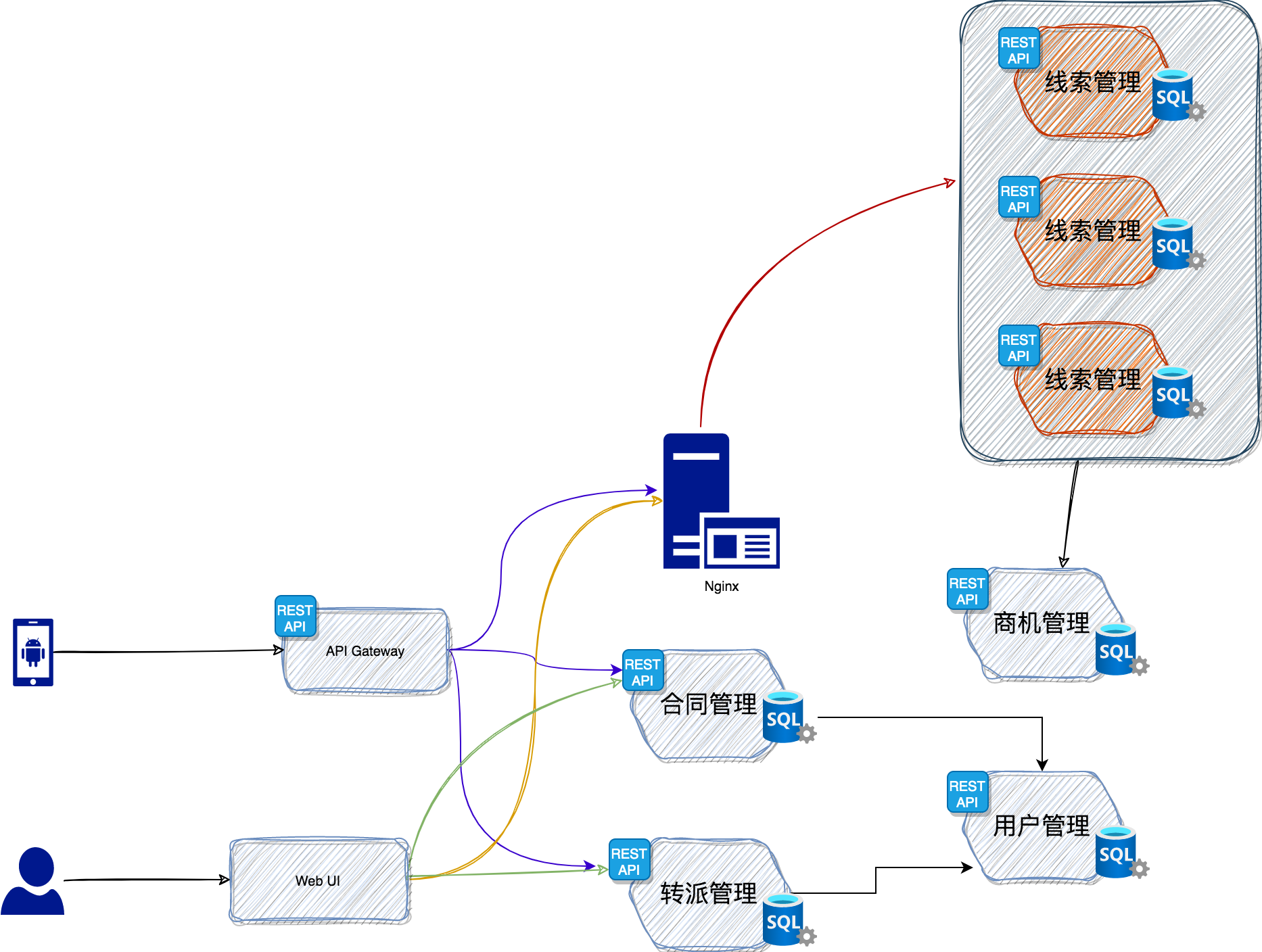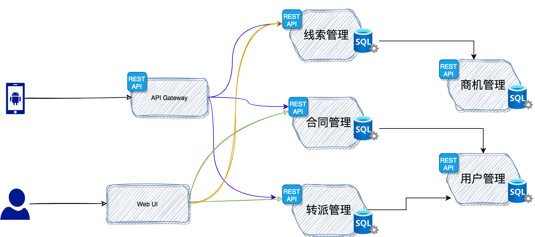 - 假设在线索管理中,需要调用商机管理,那不能直接操作商机的数据库,必须去调用商机管理服务中提供的 REST API,通过这个 REST API 来操作库。
