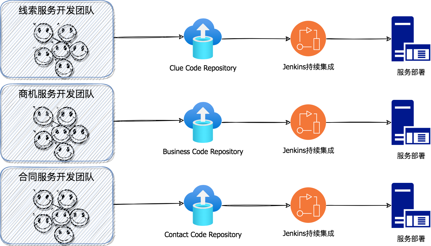 现在,我们的每一个服务都有自己独立的团队、独立的代码仓库、独立的自动化部署流水线,且互不相扰,如下图这样: