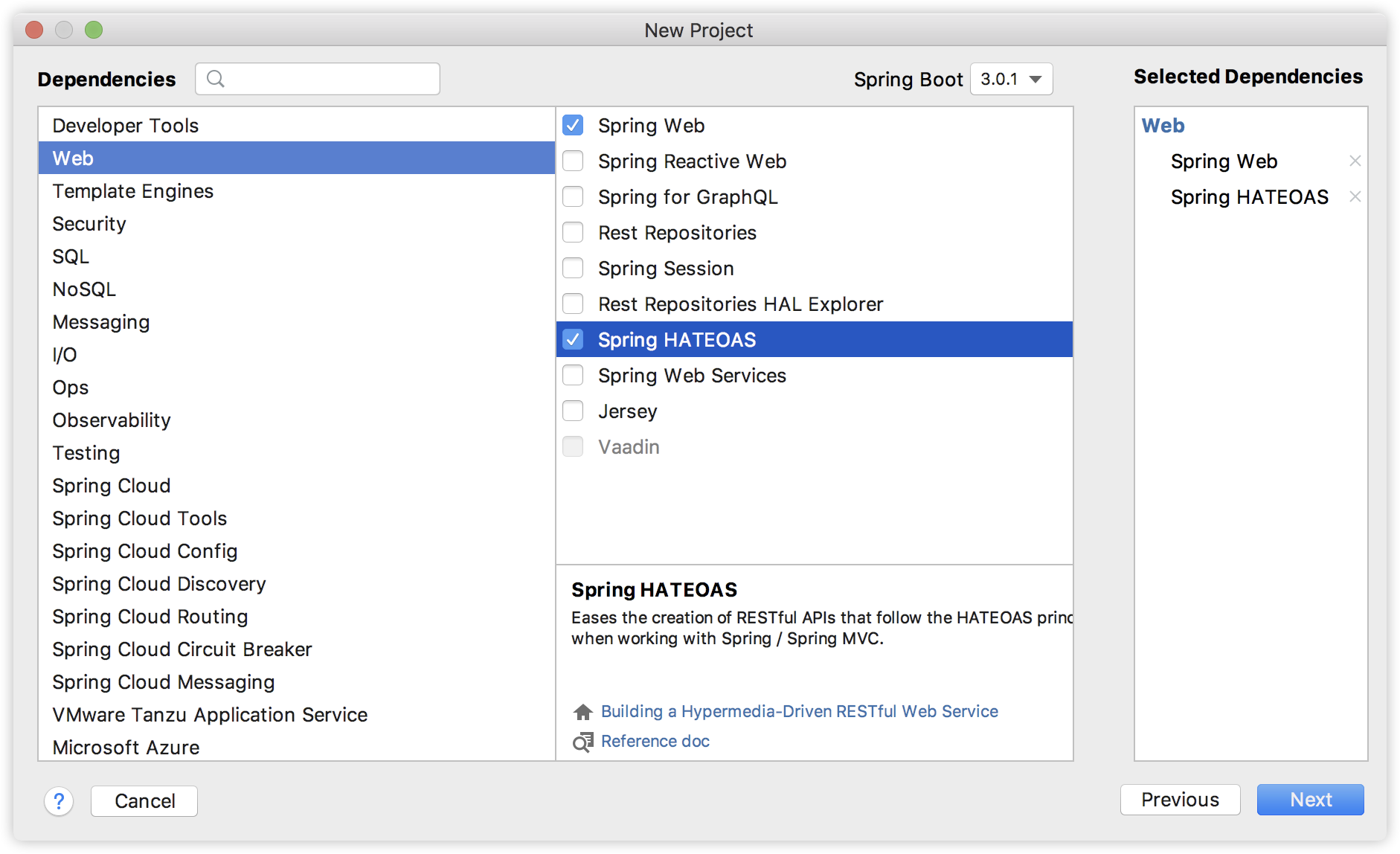 首先我们创建一个 Spring Boot 工程,引入 Web 和 Spring HATEOAS 依赖,如下: