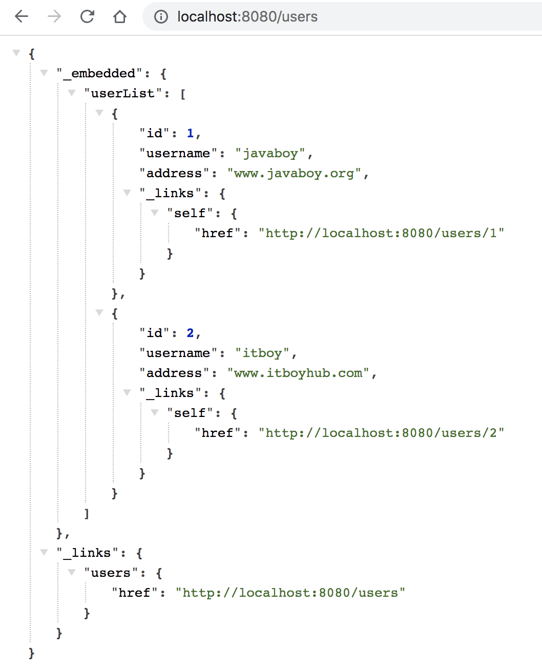 可以看到,返回的每一个 user 对象中,都有一个链接表示如何单独访问这个对象。最下面还有一个访问所有对象的链接。