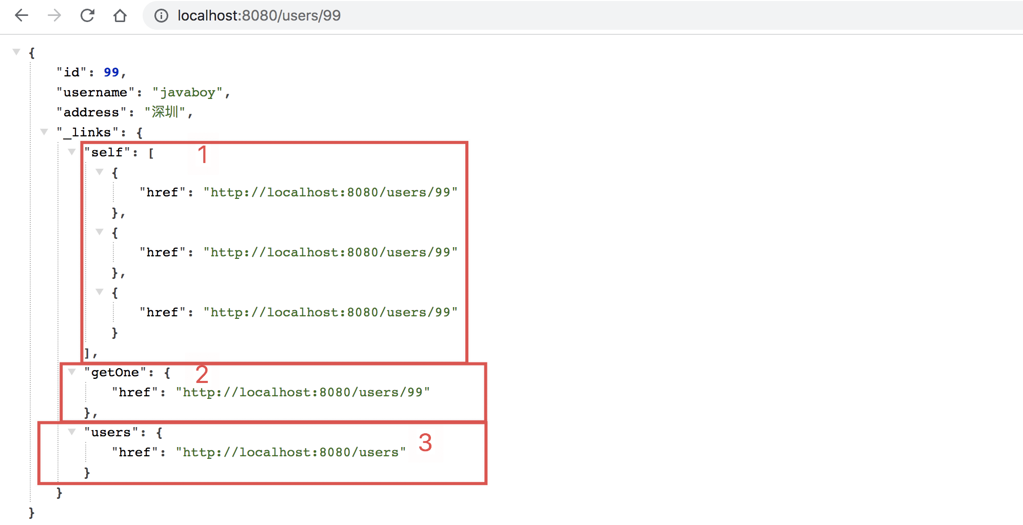 - 第一部分,self,就是自身的访问链接,这三个链接分别是 User 的构造方法,以及前面提到的 3.3 和 3.4 的方法生成的。