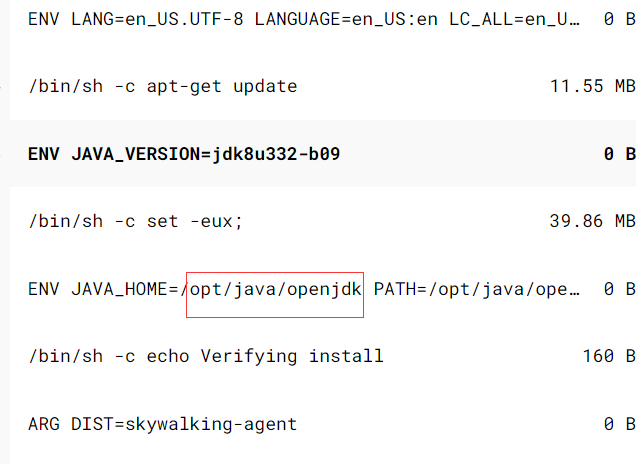那如何知道java.security的具体位置呢? 这边提供一个思路,如果是自制的基础镜像,可以去问公司自制这个镜像的作者,如果是公有的镜像,可以通过docker hub,比如我们这个项目的镜像是用到skywalking-java-agent:8.11.0-java8,因此我们就可以去docker hub,搜索该镜像,然后点开详情,里面有的会有IMAGE LAYERS