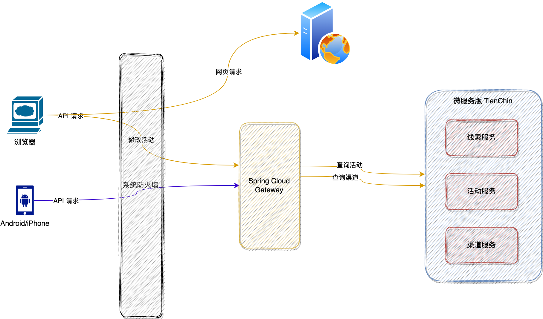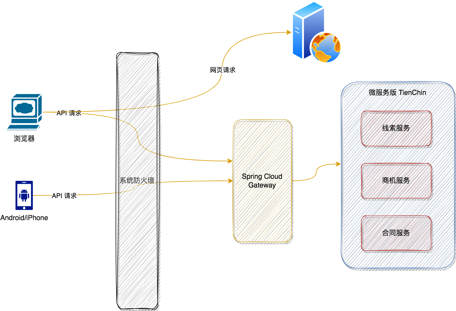 如果用 Spring Cloud Gateway 做请求路由转发,我们可以画一张简单的架构图,如下: