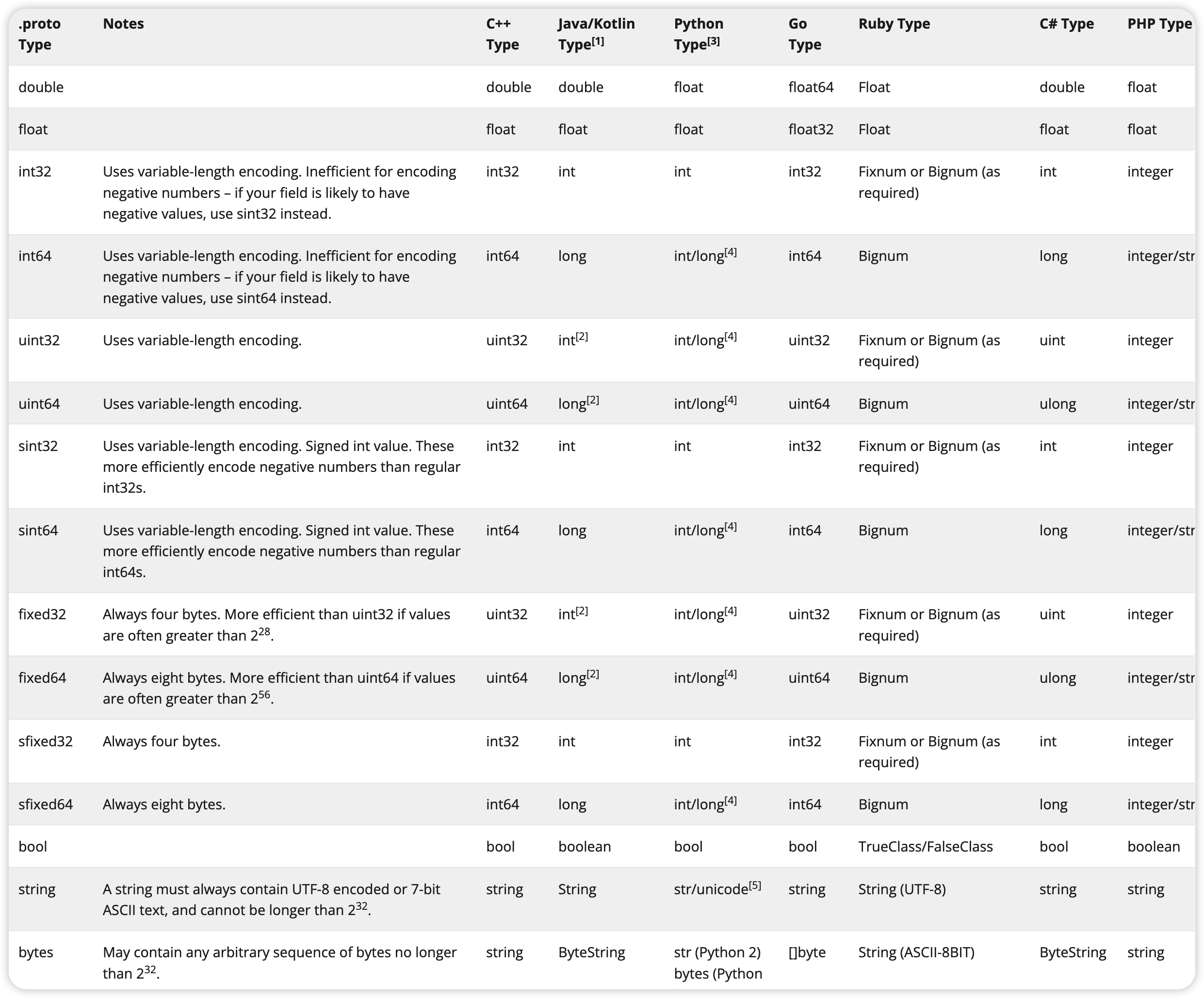 message 中定义的有点像我们 Java 中定义的类,但是不能直接使用 Java 中的数据类型,毕竟这是 Protocol buffers,这个是和语言无关的,将来可以据此生成不同语言的代码,这里我们可以使用的类型和我们 Java 类型之间的对应关系如下: