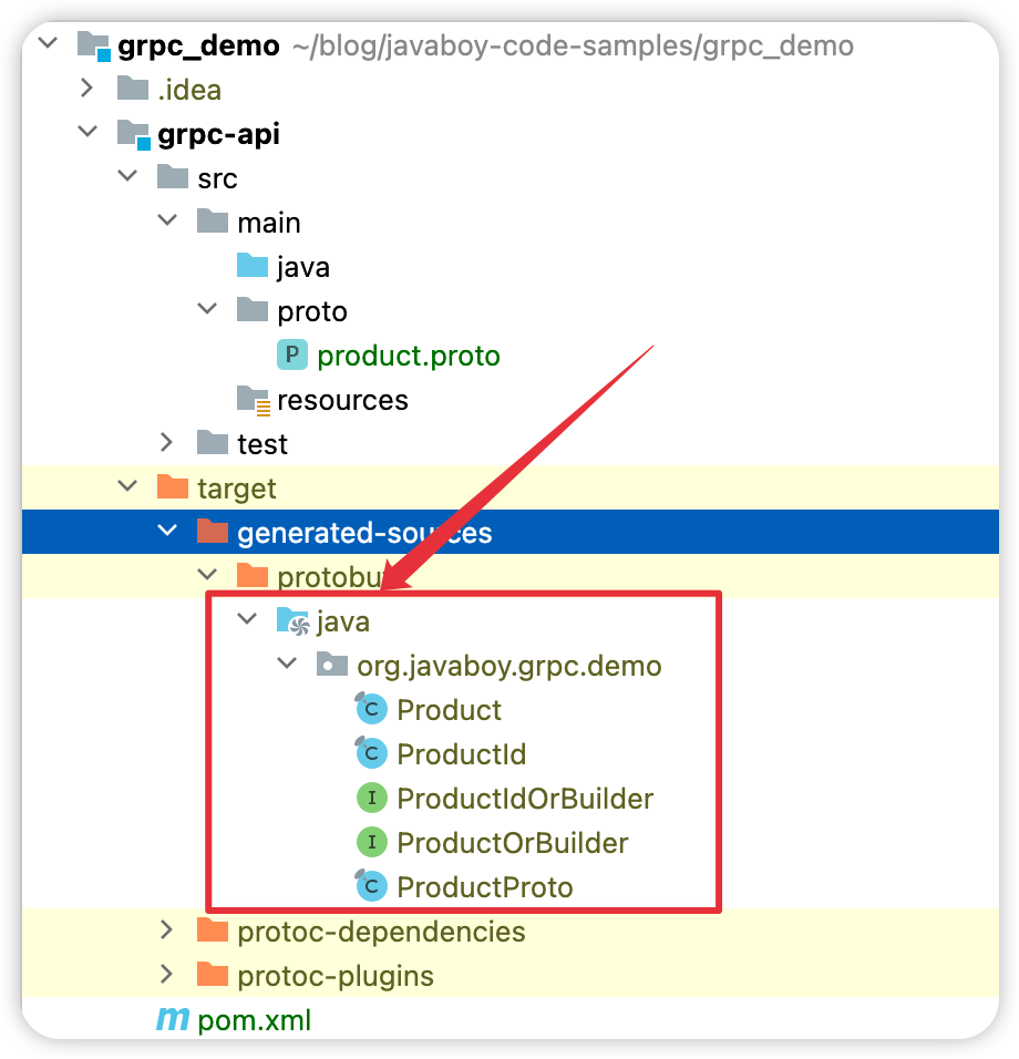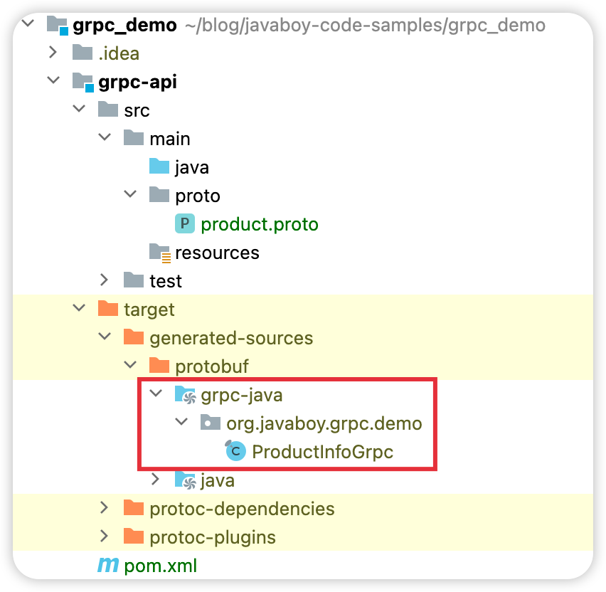 syntax = "proto3";:这个是 protocol buffers 的版本。option java_multiple_files = true;:这个字段是可选的,如果设置为 true,表示每一个 message 文件都会有一个单独的 class 文件;否则,message 全部定义在 outerclass 文件里。option java_package = "org.javaboy.grpc.demo";:这个字段是可选的,用于标识生成的 java 文件的 package。如果没有指定,则使用 proto 里定义的 package,如果package 也没有指定,那就会生成在根目录下。option java_outer_classname = "ProductProto";:这个字段是可选的,用于指定 proto 文件生成的 java 类的 outerclass 类名。什么是 outerclass?简单来说就是用一个 class 文件来定义所有的 message 对应的 Java 类,这个 class 就是 outerclass;如果没有指定,默认是 proto 文件的驼峰式;package product;:这个属性用来定义 message 的包名。包名的含义与平台语言无关,这个 package 仅仅被用在 proto 文件中用于区分同名的 message 类型。可以理解为 message 全名的前缀,和 message 名称合起来唯一标识一个 message 类型。当我们在 proto 文件中导入其他 proto 文件的 message,需要加上 package 前缀才行。所以包名是用来唯一标识 message 的。service:我们定义的跨平台方法都写在 service 中,上面的案例中我们定义了两个方法:addProduct 表示添加一件商品,参数是一个 Product 对象,返回值则是刚刚添加成功的商品的 ID;getProduct 则表示根据 ID 查询一个商品,参数是一个商品 ID,返回值则是查询到的商品对象。这里的定义相当于一个接口,将来我们要在 Java 代码中实现这个接口。message:这里有点像我们在 Java 中定义类,上文中我们定义了两个类,分别是 Product 和 ProductId 两个类。这两个类在 service 中被使用。