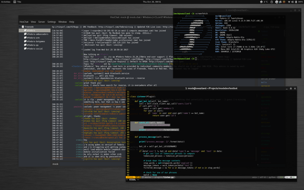 为了搞摄影,McIntyre 用上了 GIMP、Darktable,以及其他一些照片查看包和快速编辑包。当不用 Web 电子邮件时,Mark 会使用 Geary,还有GNOME Calendar。Mark 选用 HexChat 作为 IRC 客户端,HexChat 与在 Fedora 服务器实例上运行的 ZNC bouncer 联机。他的部门通过 Slave 进行沟通交流。