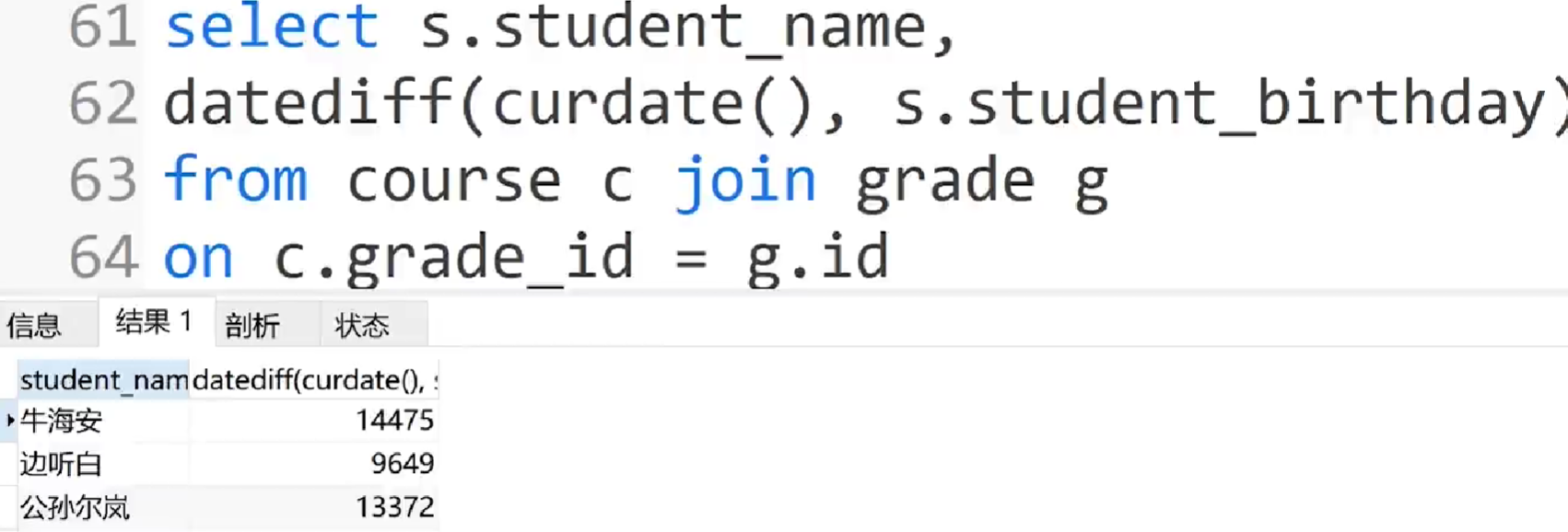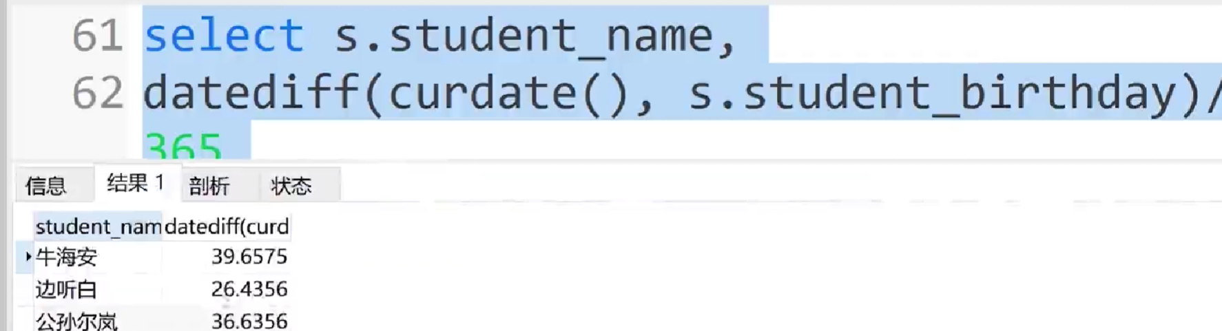 datediff(curdate(),s.student_birthday) 天换成年 除以 365: