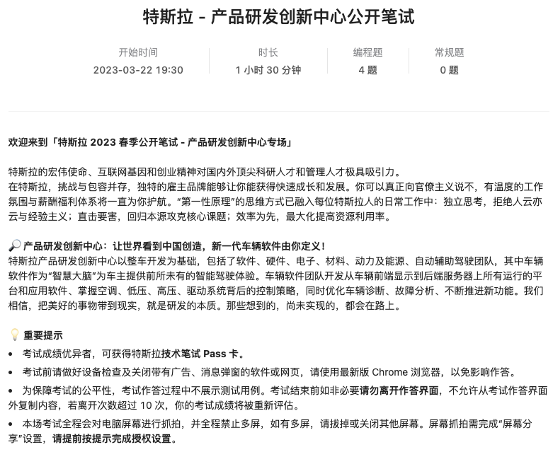 昨天是 「特斯拉 2023 春季公开笔试 - 产品研发创新中心专场」,你参加了吗?这场笔试整体来看没有难到特别离谱的题,但需要一些思维。