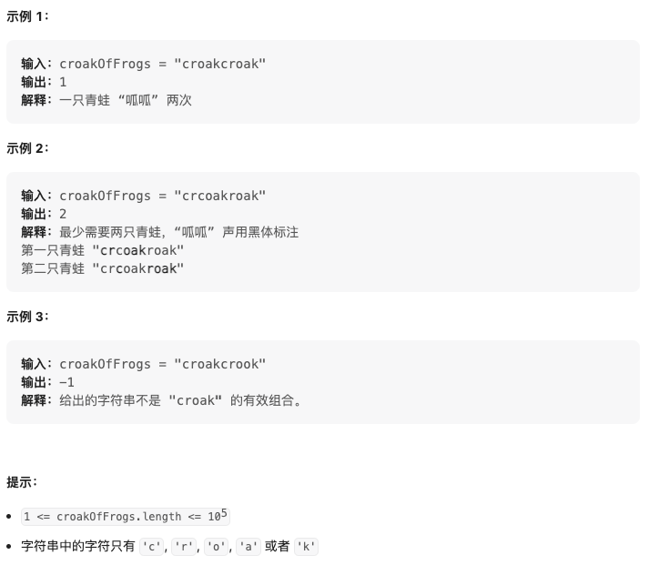 给你一个字符串 croakOfFrogs,它表示不同青蛙发出的蛙鸣声(字符串 "croak" )的组合。由于同一时间可以有多只青蛙呱呱作响,所以 croakOfFrogs 中会混合多个 “croak” 。