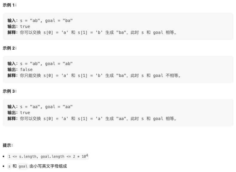 给你两个字符串 s 和 goal ,只要我们可以通过交换 s 中的两个字母得到与 goal 相等的结果,就返回 true ;否则返回 false 。