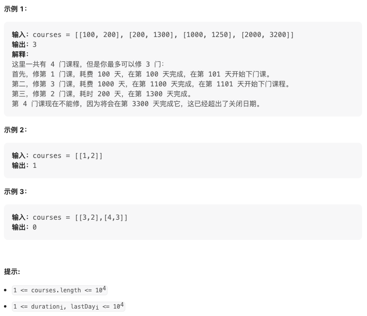 这里有 n 门不同的在线课程,按从 1 到 n 编号。给你一个数组 courses ,其中 courses[i] = [durationi, lastDayi] 表示第 i 门课将会 持续 上 durationi 天课,并且必须在不晚于 lastDayi 的时候完成。