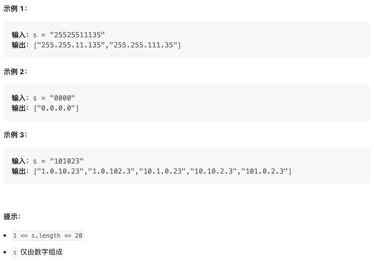 给定一个只包含数字的字符串 s ,用以表示一个 IP 地址,返回所有可能的有效 IP 地址,这些地址可以通过在 s 中插入 '.' 来形成。你 不能 重新排序或删除 s 中的任何数字。你可以按 任何 顺序返回答案。