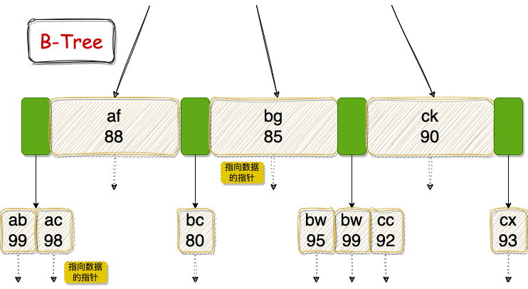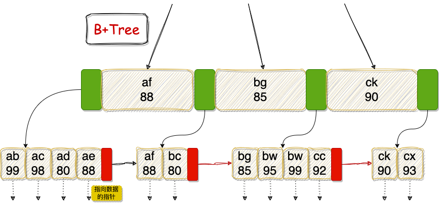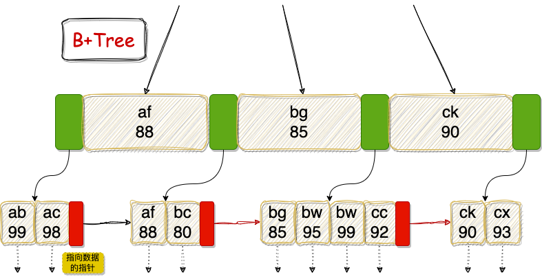 绿色的方块表示指向下一个节点的指针;红色的方块表示指向下一个叶子节点的指针(B-Tree 中不存在该部分);带阴影的矩形则表示索引数据。