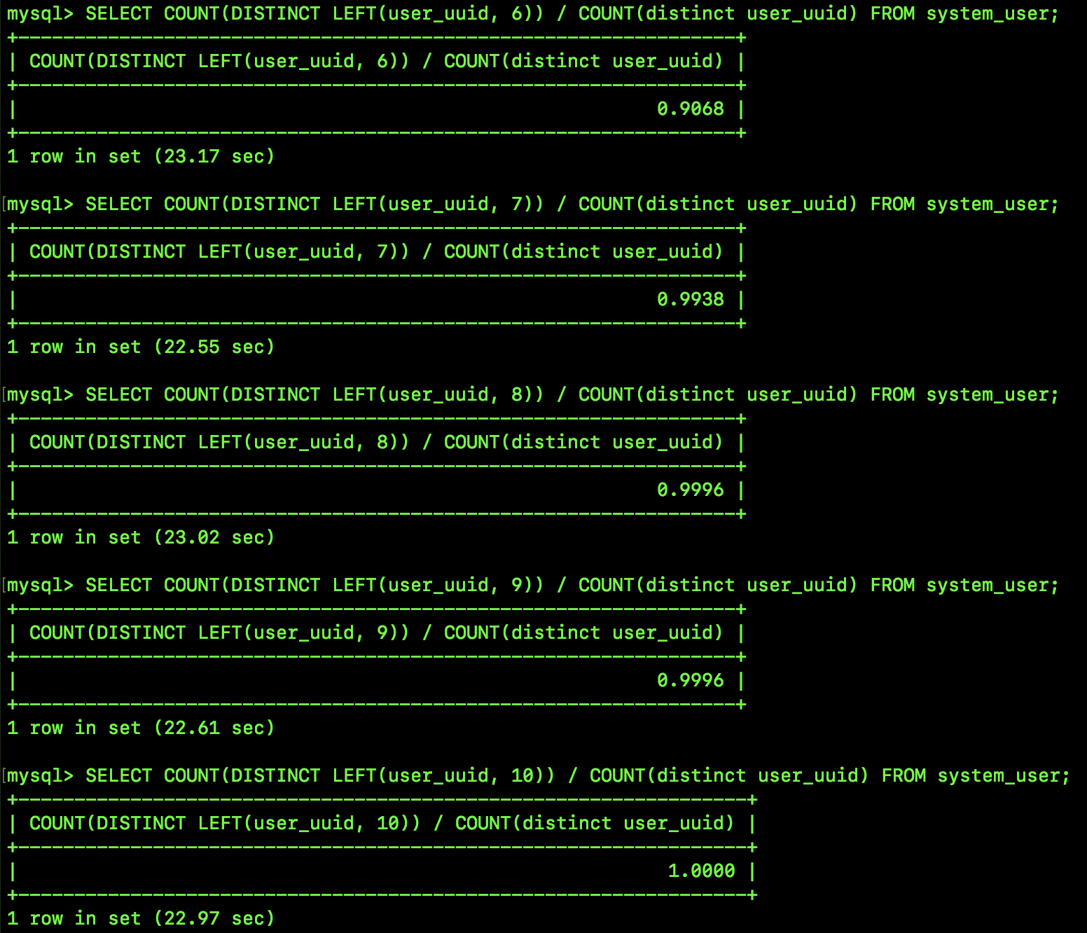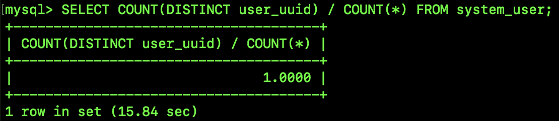 首先我们通过如下 SQL 来看一下 user_uuid 全列索引选择性是多少: