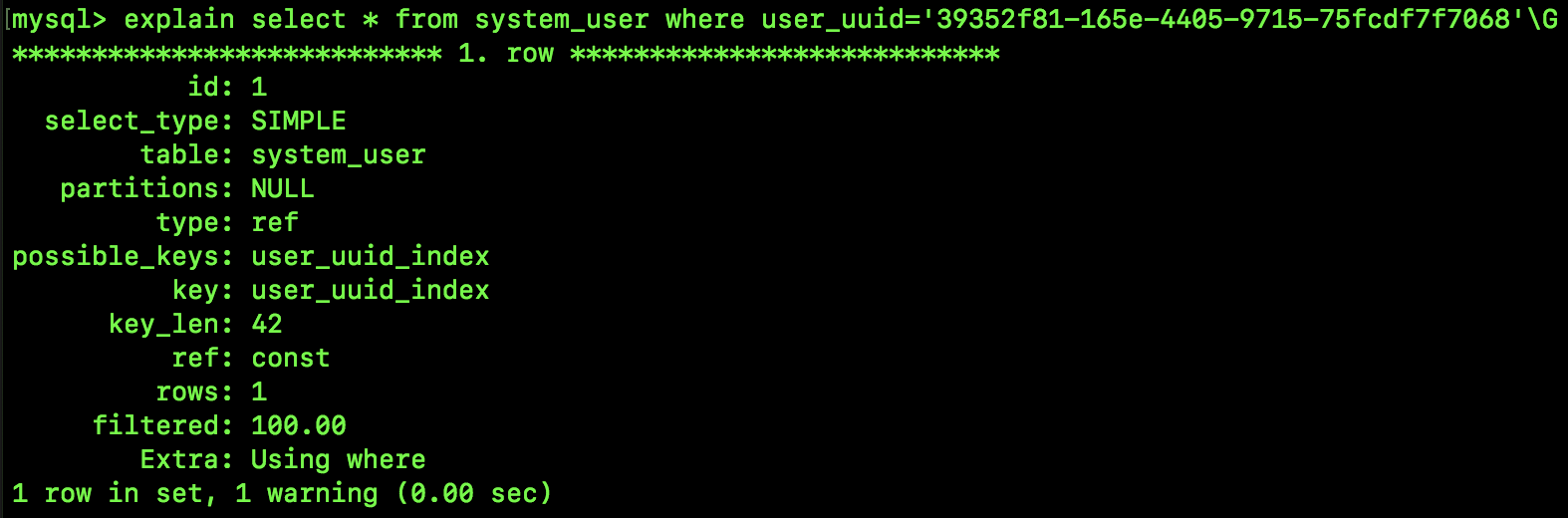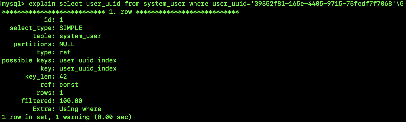 这次不是 select *,而是 select user_uuid,小伙伴们知道,这里应该是要用到覆盖索引,我们来看看执行计划: