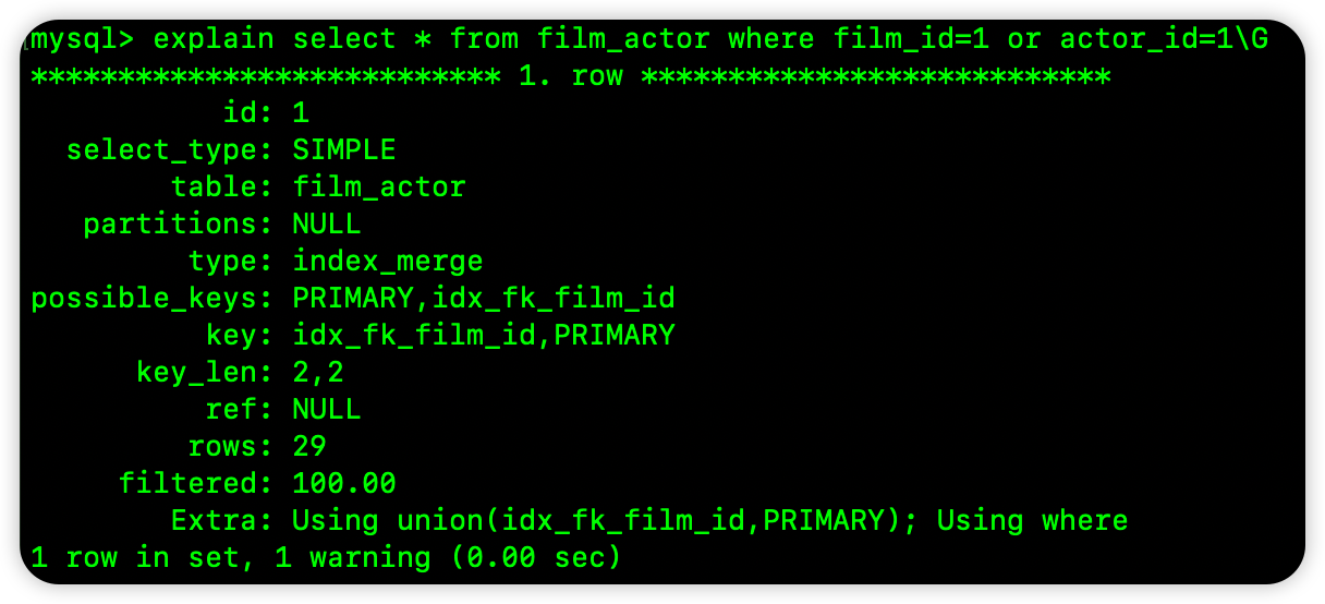 小伙伴们看到,此时 type 是 index_merge,possible_keys 和 key 中,都给出来了两个索引,Extra 中的值为 Using union(idx_fk_film_id,PRIMARY); Using where。