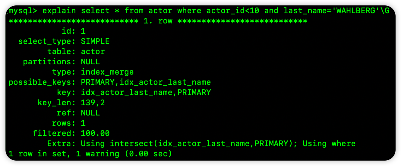 可以看到,用到了索引合并,且是 Using intersect。