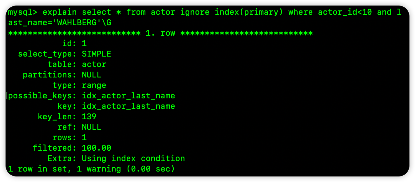 因此,有时候如果我们确定自己不需要索引合并,那么可以通过 ignore index 来忽略掉一些索引,如下(对比 2.1 小节截图):