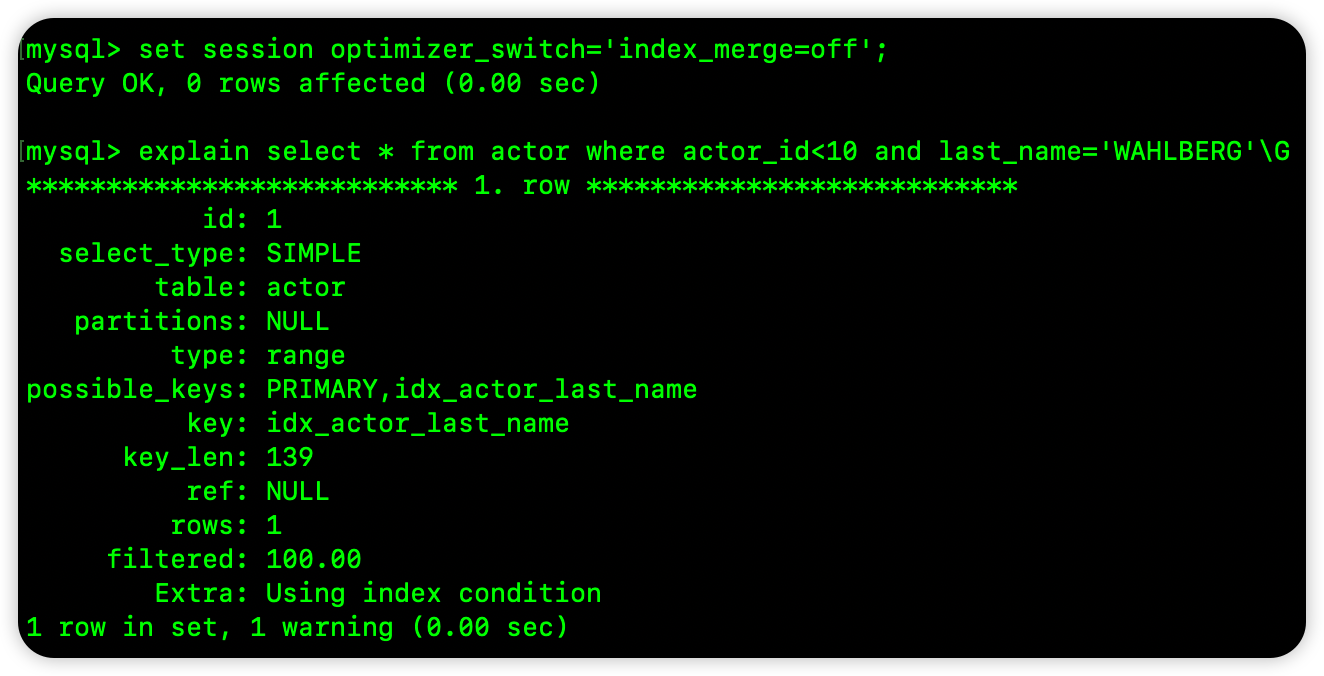 也可以通过 optimizer_switch 来关闭索引合并功能,如下: