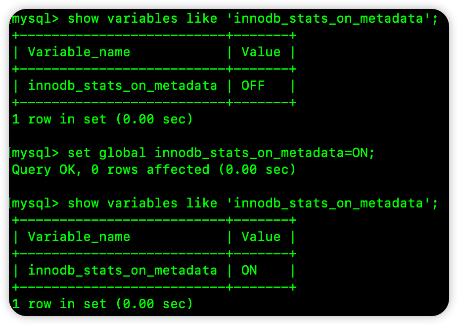 这些行为都会触发统计信息的自动更新,如果表中数据量比较大,担心以上行为降低表的性能,那么也可以修改 innodb_stats_on_metadata 参数来关闭以上行为。