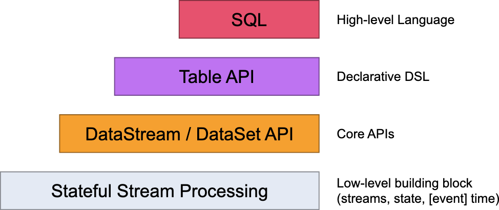 Flink提供了不同层级的API。Flink为流处理和批处理提供了不同层级的API,每一种API在简洁性和表达力上有着不同的侧重,并且针对不同的应用场景,不同层级的API降低了系统耦合度。