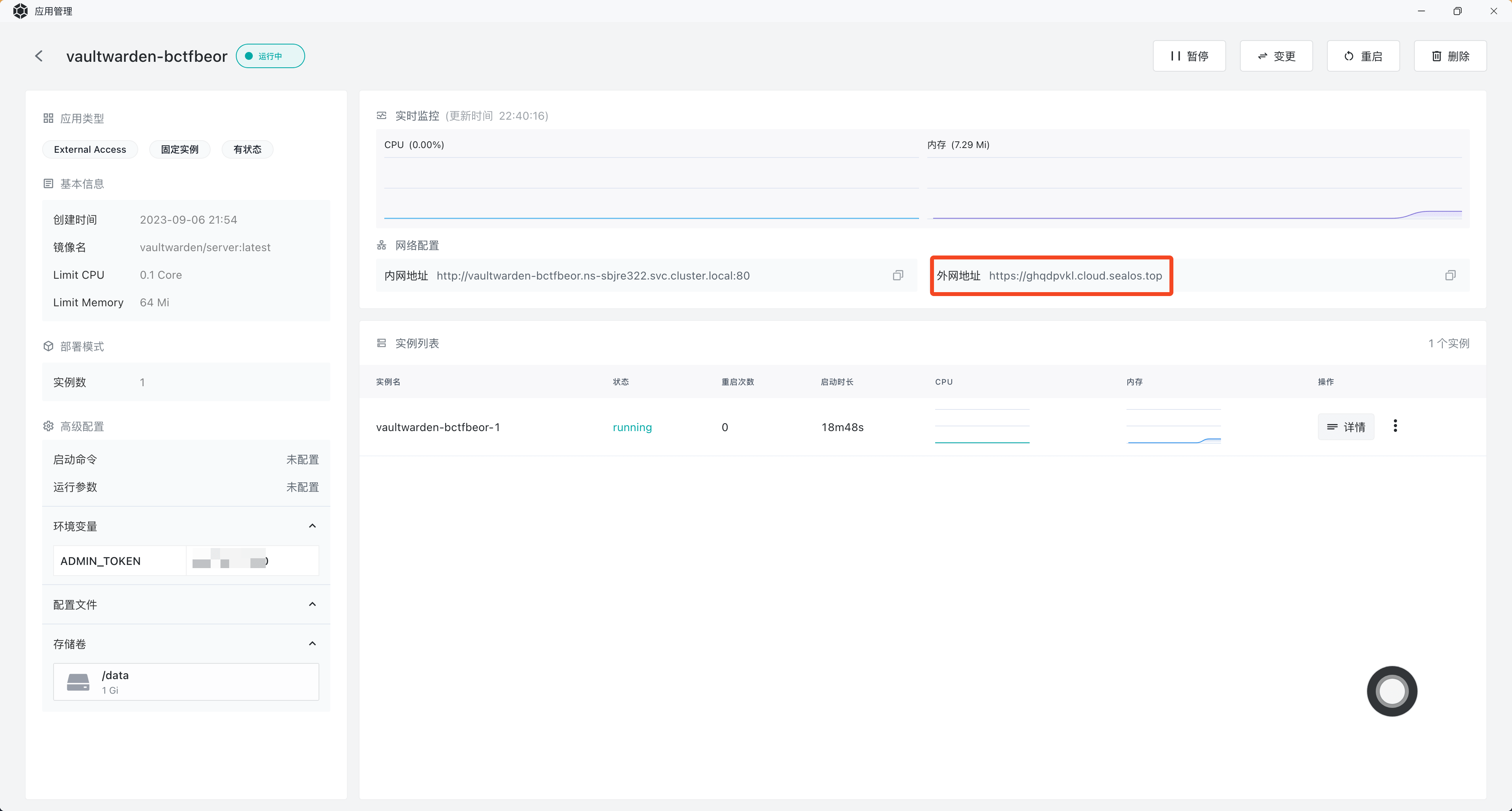 部署完成后,点击确认跳转到应用详情页面,可以看到应用已经启动成功了。点击外网地址即可直接打开 Vaultwarden 的 Web 界面: