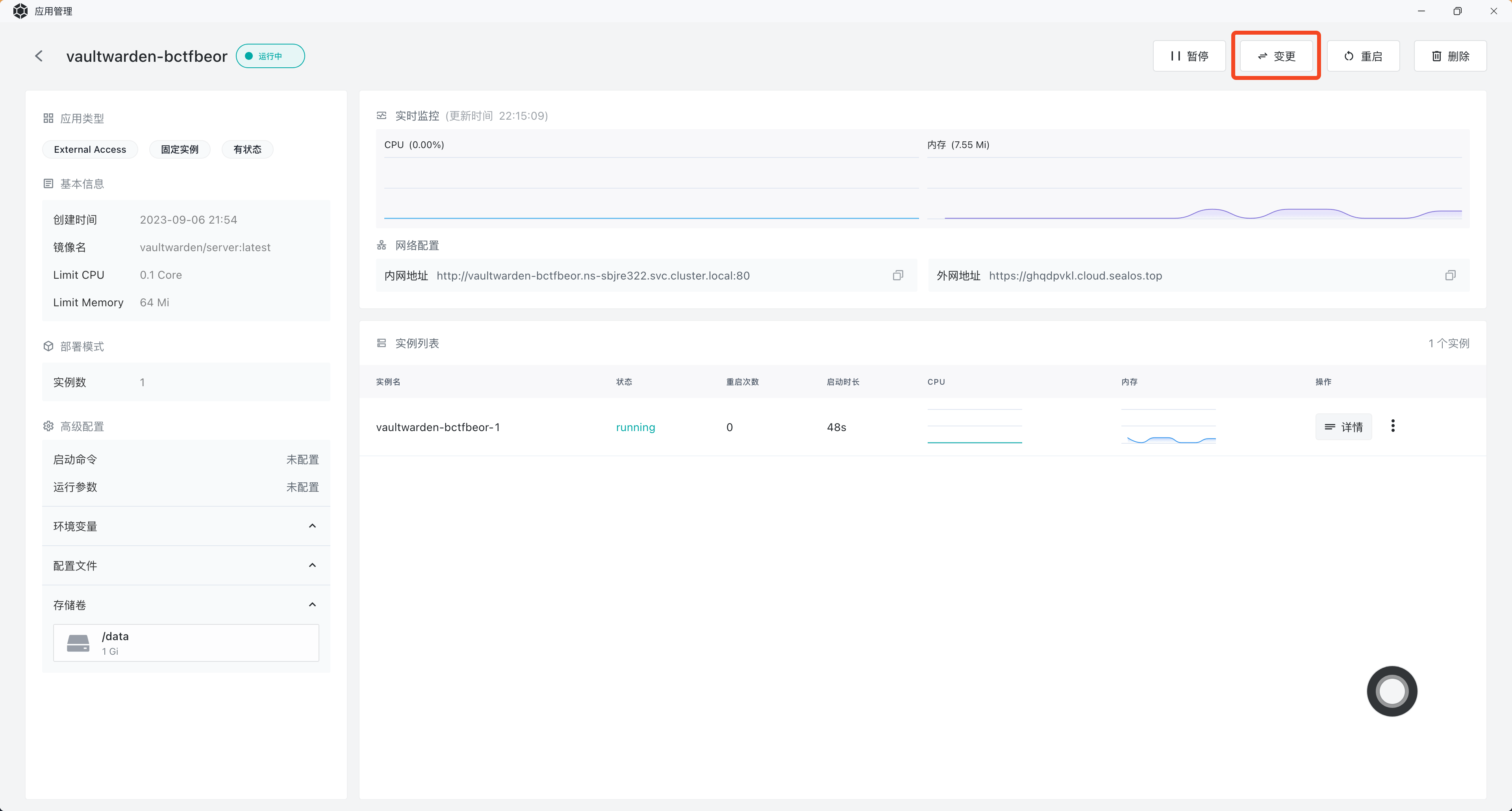 现在我们来评估一下在 Sealos 上运行 Vaultwarden 大概需要多少钱。点击「变更」: